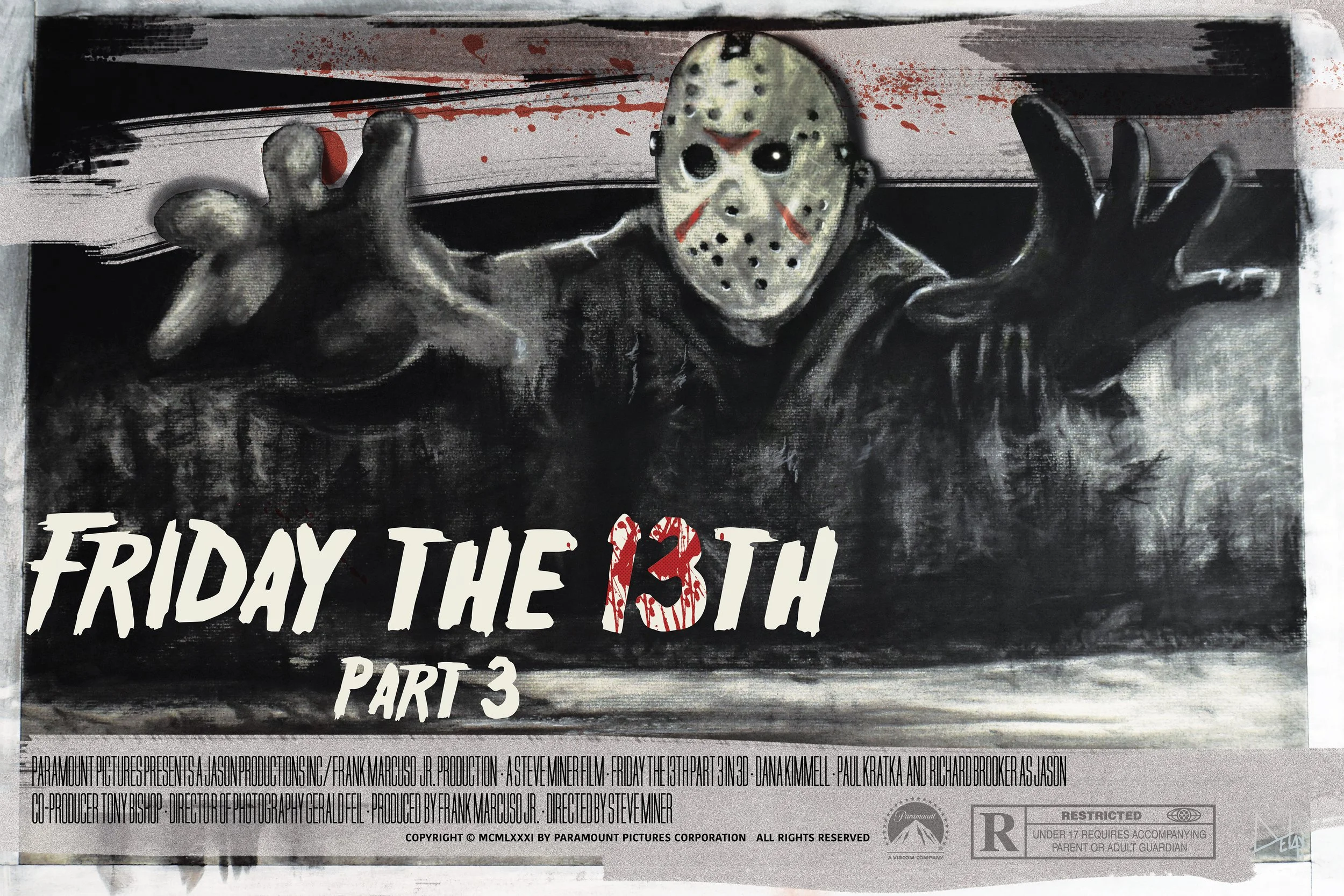 Unofficial screen print inspired by Paramount Picture’s Friday the 13th Part 3. Charcoal drawing turned digital in Adobe Photoshop and Illustrator.