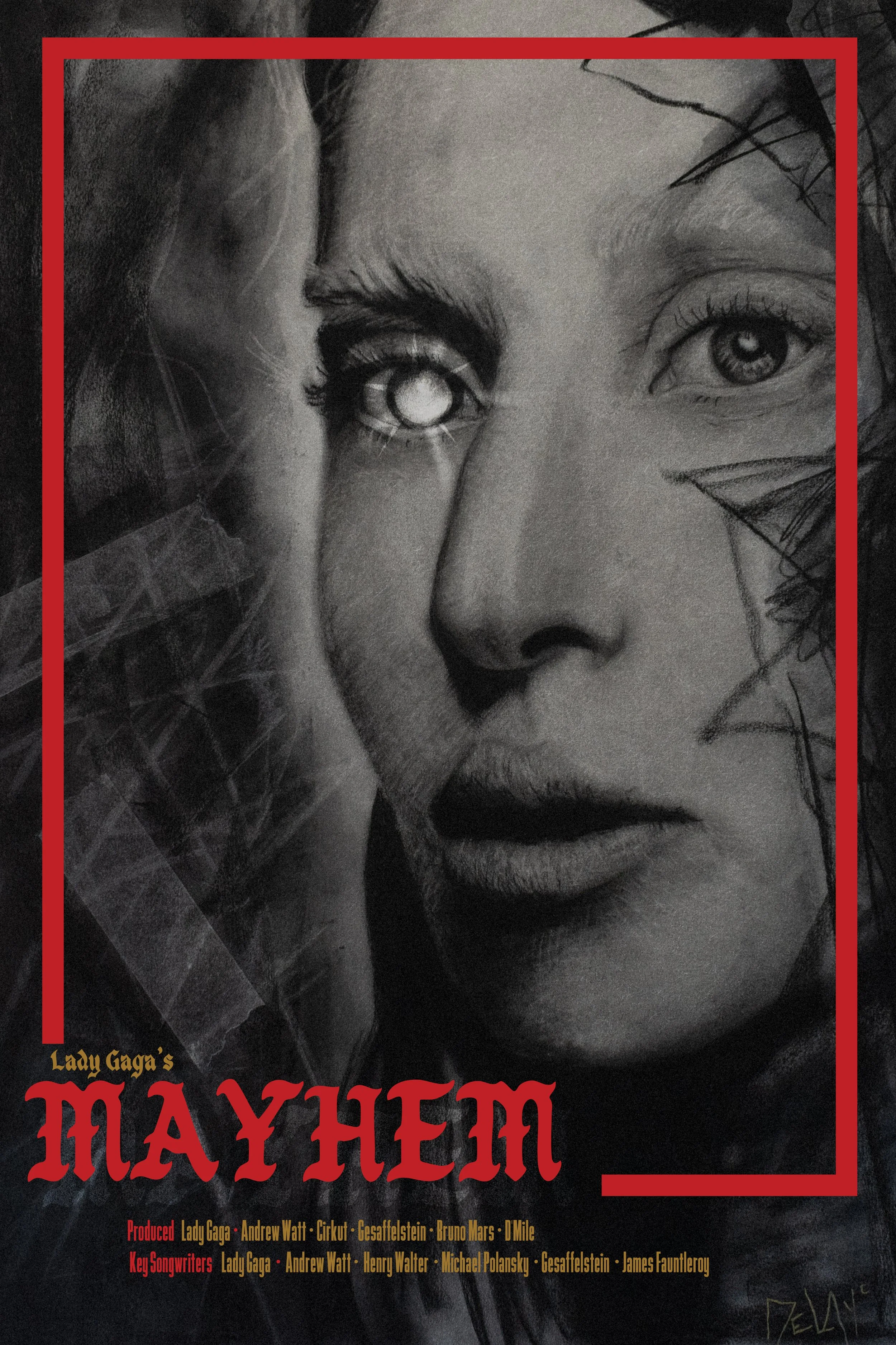 Unofficial screen print inspired by Lady Gaga’s Mayhem album. Charcoal drawing turned digital in Adobe Photoshop and Illustrator.